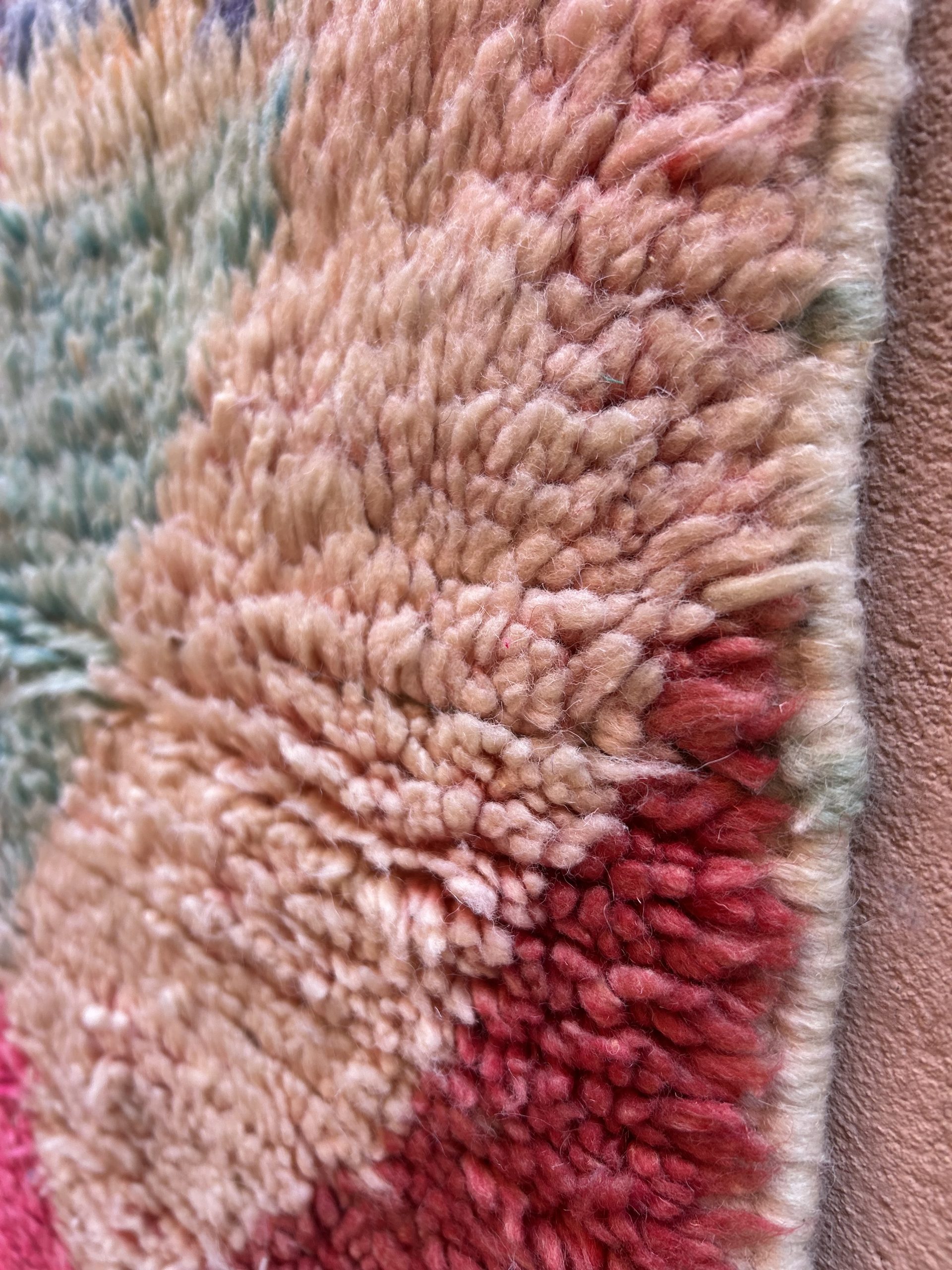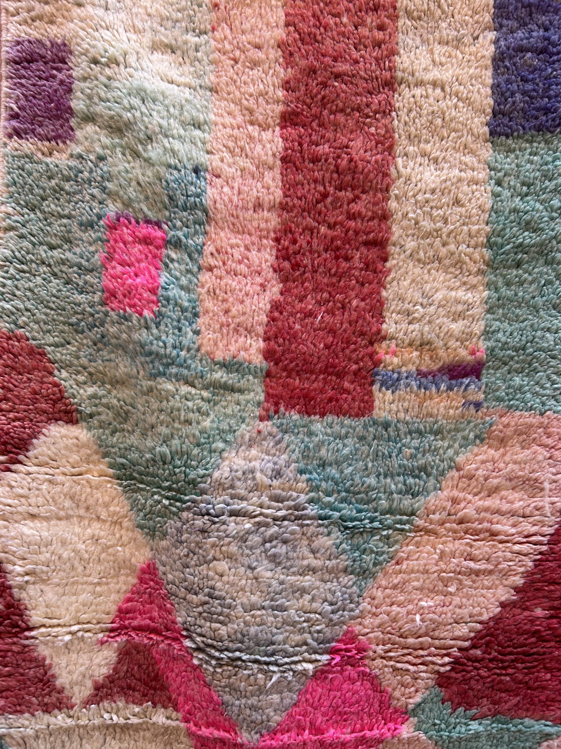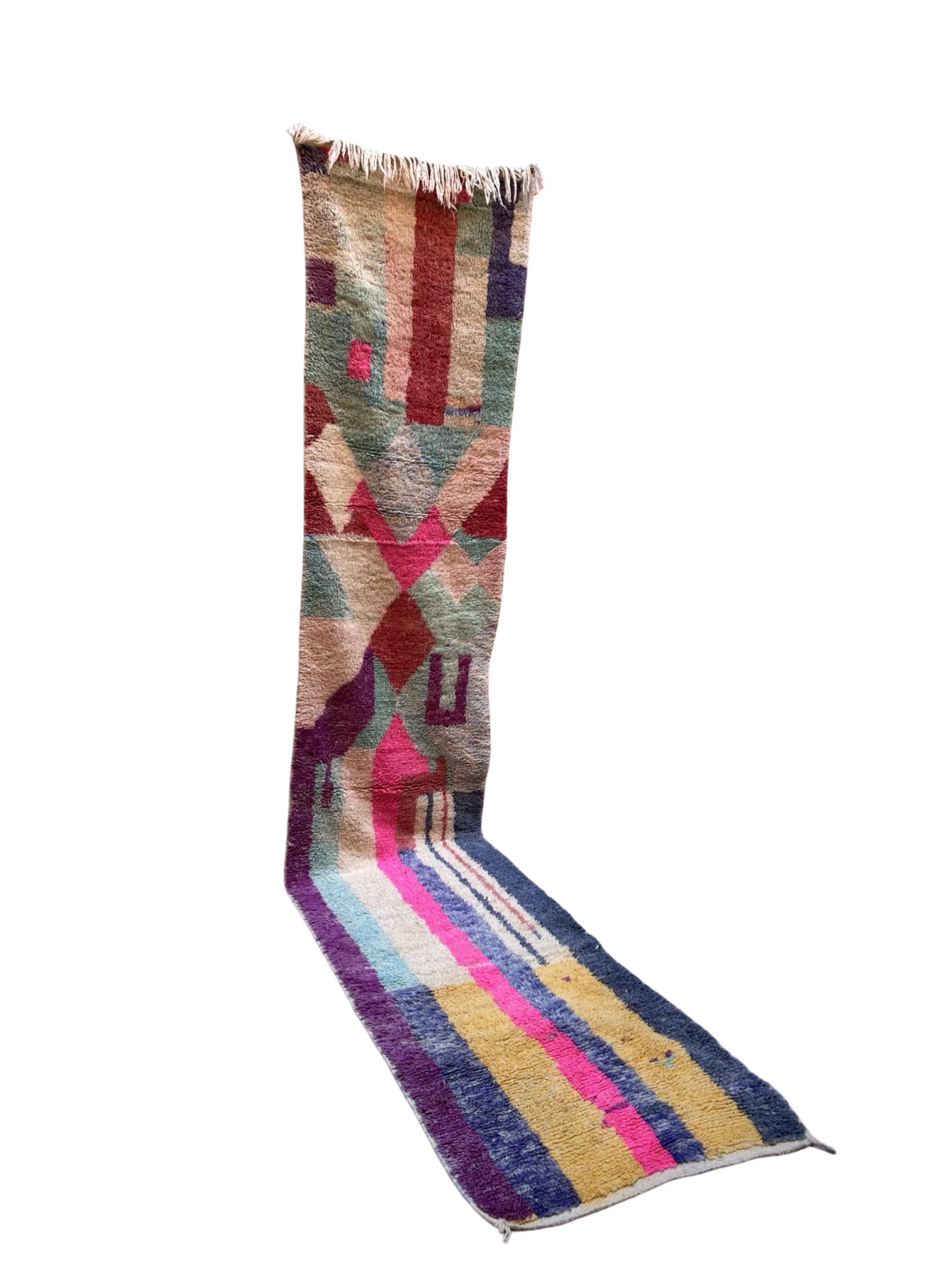 Grand Tapis de couloir Boujaad 100% laine Années 2000 Il est très long et coloré Ses motifs géométriques apportent du relief et volume au visuel, optez pour un long couloir ou un grand passage de salon ou chambre Coloris variés, rose, jaune, bleu, violet Il est assez abstrait et contemporain pour le marier avec divers styles Pièce unique Laine 395x80cm Moyen atlas, Maroc