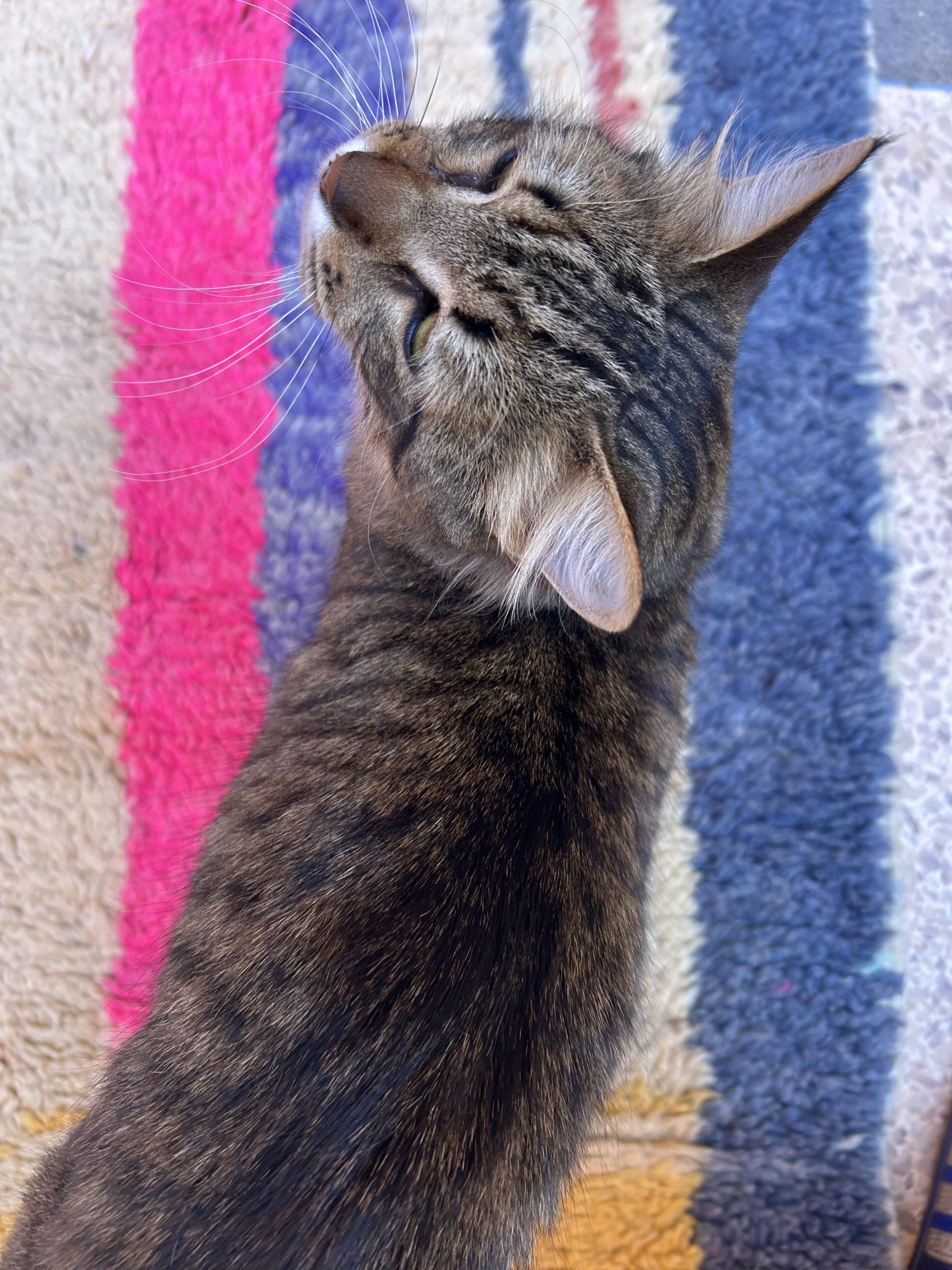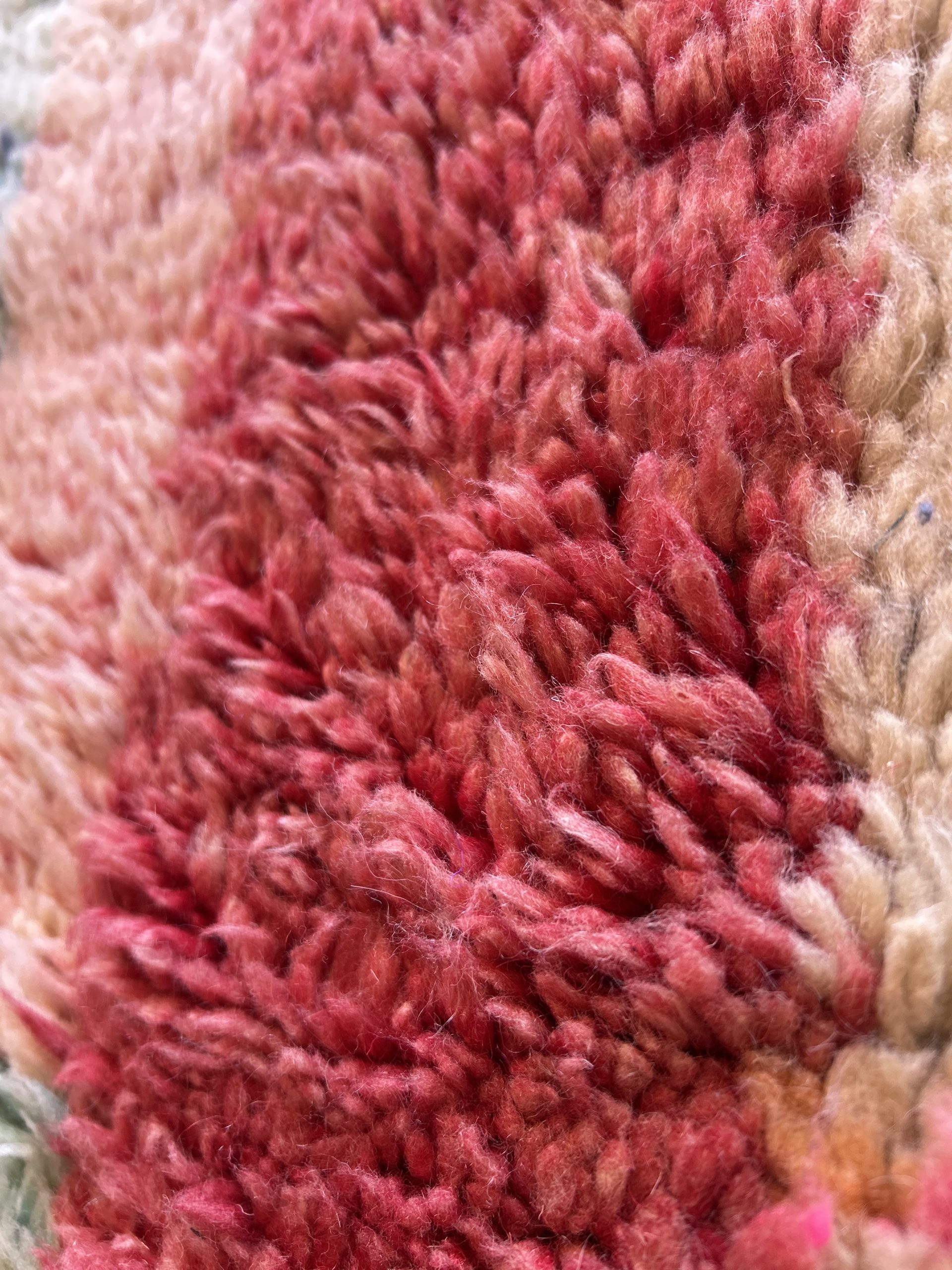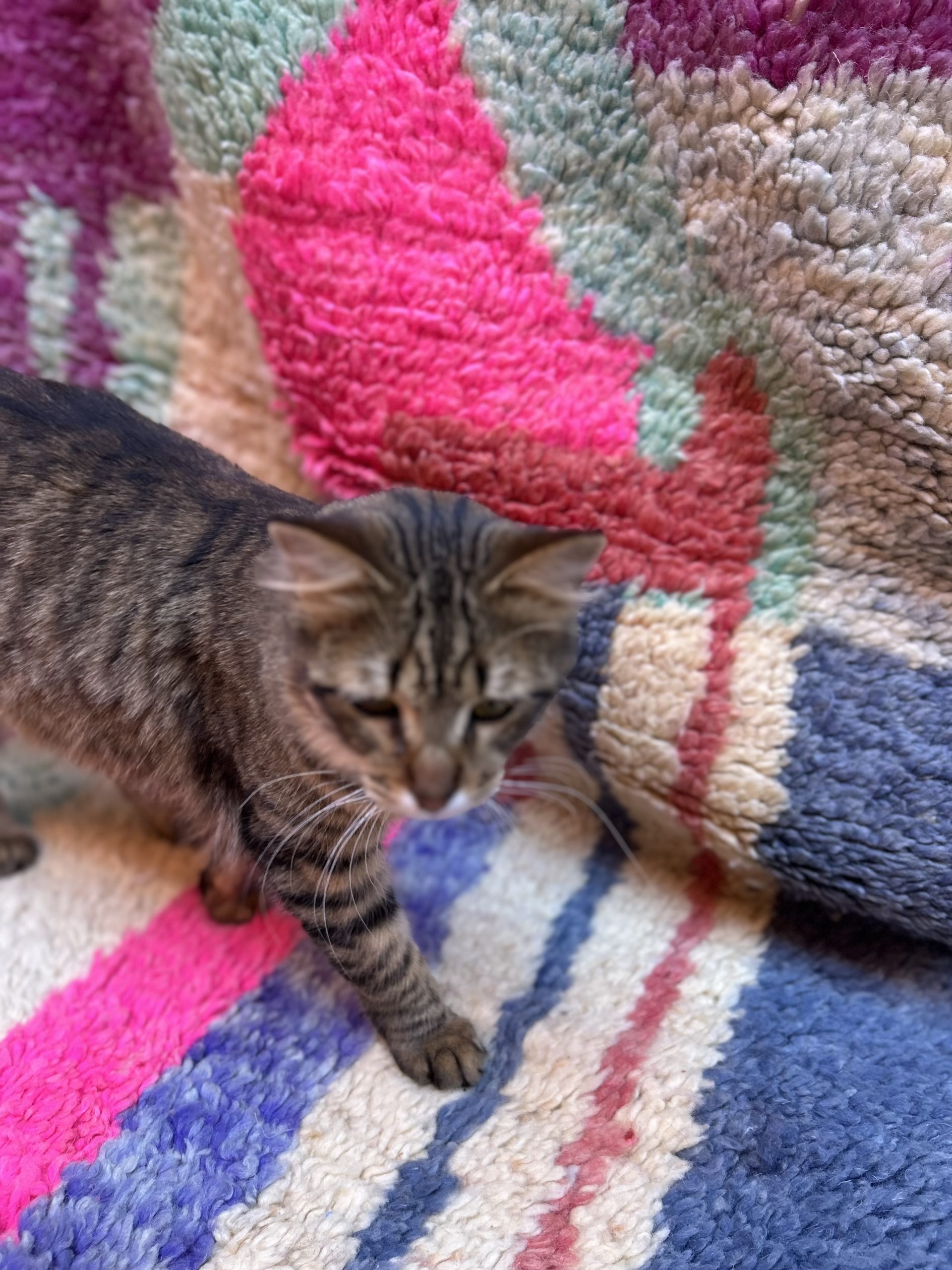 Grand Tapis de couloir Boujaad 100% laine Années 2000 Il est très long et coloré Ses motifs géométriques apportent du relief et volume au visuel, optez pour un long couloir ou un grand passage de salon ou chambre Coloris variés, rose, jaune, bleu, violet Il est assez abstrait et contemporain pour le marier avec divers styles Pièce unique Laine 395x80cm Moyen atlas, Maroc